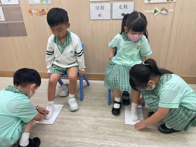 想做一對合穿的鞋子,該怎樣做?原來首先要量一量自己的腳有多大,小朋友們除了向他人介紹不同鞋子的特性外,還舉行了(Catwalk Show),展示不同的鞋子呢!