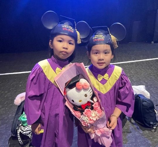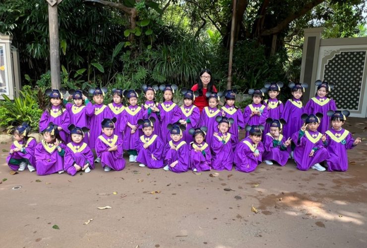 小朋友們首次穿上畢業袍,戰戰競競卻難掩興奮之情;米奇老鼠也換上了畢業袍,與小朋友來張大合張!