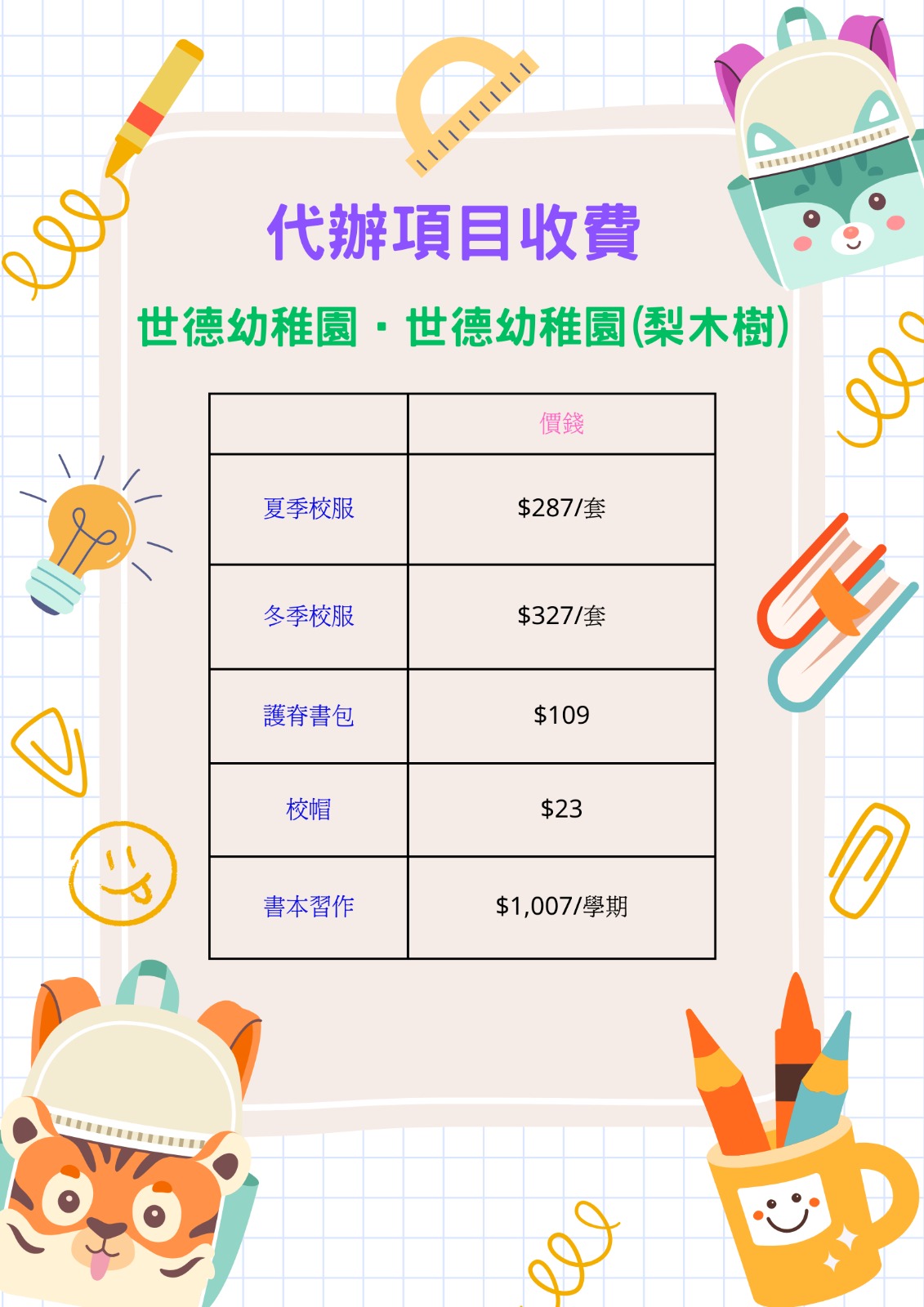 收生程序 1.報名日期 •日期:2024年 9 月7日 起 至 額滿止 • 時間:星期一至星期五 (上午 9 時 至 下午 5 時) 星期六 (上午 9 時 至 下午 1時) (註:星期六或會因學校活動而未能提供服務,貴家長如選擇於星期六到校辦理手續,煩請致電本校2253 6288(天水圍) / 3446 9178 (梨木樹) 預約。不便之處,懇請見諒。) 2. 索取報名表 (不設限額) • 親臨本幼稚園索取 或 於本幼稚園網頁下載報名表 3.報名方法 家長可透過下列方式遞交報名表: i) 親臨本校報名 • 將填妥的報名表連同所需文件及報名費到本校辦理報名手續。 ii) 郵寄報名表 • 將填妥的報名表連同所需文件及報名費支票郵寄至本幼稚園 (請勿郵寄現金)註:天水圍校支票抬頭:世德幼稚園 梨木樹校支票抬頭:世德幼稚園(梨木樹) ii) 網上報名 • 登入本校網頁報名,完成後請按指示上載所需文件 4.報名費 40元 5.申請「2025/26 幼稚園入學註冊證」 • 教育局現已推行免費優質幼稚園教育政策。在此計劃下,教育局會以「幼稚園入學註冊證」作為2025/26學年的 K1 註冊文件。 • 家長須於 2024年 9 月至 11 月期間為其子女向教育局申請「2025/26 幼稚園入學註冊證」 。「2025/26 幼稚園入學註冊證」會於本年 9 月開始接受申請,屆時教育局會公布申請細則,並上載於教育局網頁。 6.收生準則 • 優先考慮 – 兄 / 姐 / 弟 / 妹在本幼稚園或本校屬校幼稚園就讀 – 兄 / 姐為本幼稚園或本校屬校幼稚園畢業生 – 父 / 母為本校辦學團體的員工/成員 – 就近入學 – 其他考慮因素 申請全日班學位,有家庭需要的申請人可獲優先考慮。註:由於學位所限,並非所有符合優先考慮的申請人均可獲取錄。 – 面試表現 7.面見安排 • 面見形式家長須陪同幼兒參與面見遊戲及談話 — 個人/小組 • 通知面見學校將以郵寄方式寄出申請人的面見證 • 傳譯/翻譯服務 非華語學生如需要傳譯/翻譯服務,請致電 2253 6288 (天水圍校)/ 3446 9178 (梨木樹校) 與本幼稚園聯絡。學校亦會接納申請人及兒童由懂中文的親友陪同面見協助溝通。 8.公布取錄結果安排 • 無論取錄與否,本幼稚園將於 2024年 12 月13日前以郵遞方式通知家長取錄結果。 9.註冊安排 • 正選生 – 家長須於 2025 年 1 月2 日至 4 日(『統一註冊日』)內的指定時間到本幼稚園辦理註冊手續; 及 – 提交「2025/26 幼稚園入學註冊證」正本; 及 – 繳交註冊費 • 備取生 – 當正選生未能於註冊期內到校辦理註冊手續,即表示自動放棄學位,學校會通知備取生取代其學位; – 屆時,本幼稚園會以郵遞方式發出通知,請家長於指定日期到本幼稚園辦理註冊手續,並須提交「2025/26 幼稚園入學註冊證」正本及繳交註冊 費。 • 未獲取錄 – 家長可於 2024年 1月底參考教育局網頁、各區域教育服務處及電話熱線等公布的『幼稚園幼兒班(K1)空缺資訊』,以協助家長為子女找尋學位。 • 備註 – 家長請留意,如未能在指定的註冊日期提交有效的註冊文件,本幼稚園或未能為獲取錄兒童完成手續,因此家長務必於指定日期內向教育局申請「2025/26 幼稚園入學註冊證」。 – 2025/26 學年的半日班註冊費為港幣970元,全日班的註冊費為港幣1,570元。如有關兒童入讀本校,註冊費將於開學後首月退回家長。 – 但若家長於註冊後決定為子女轉校,請以書面通知本幼稚園。本幼稚園會退回「2025/26 幼稚園入學註冊證」,但註冊費將不獲退還。在取回「2025/26 幼稚園入學註冊證」後,本幼稚園亦不會再為該兒童保留學位。 10.代辦項目 ● 學費 ● 代辦項目 – 校服書本習作等雜項 11.學校概覽 ● 世德幼稚園 ● 世德幼稚園(梨木樹)